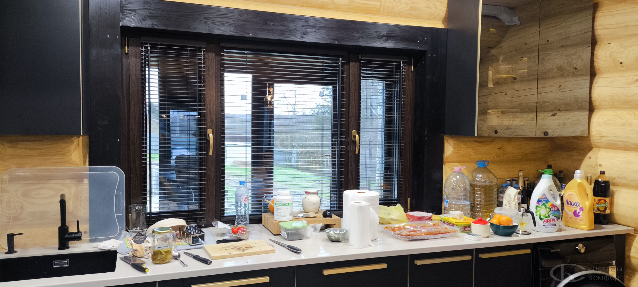 Жалюзи можно собрать полностью или оставить опущенными, но повернуть планки параллельно подоконнику — так свет будет беспрепятственно проникать в помещение.
